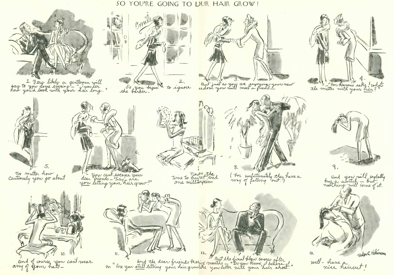 To close, a two-page spread by Helen Hokinson exploring one woman’s challenge with the “flapper bob” (sorry about the crease in the scan–that is how it is reproduced in the online archive). Click the image to enlarge.