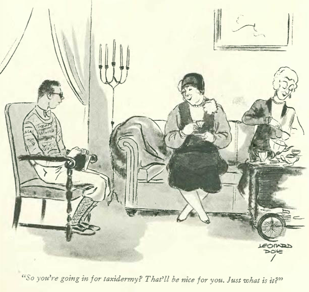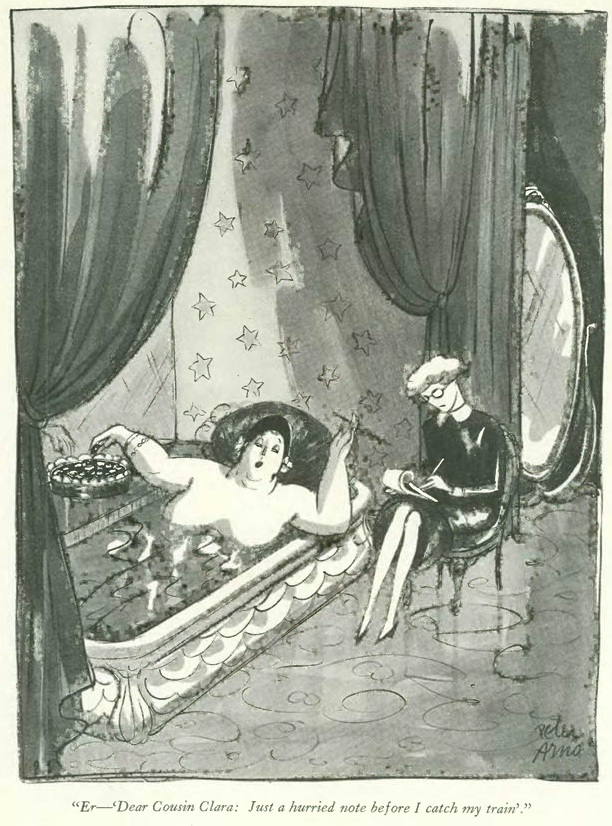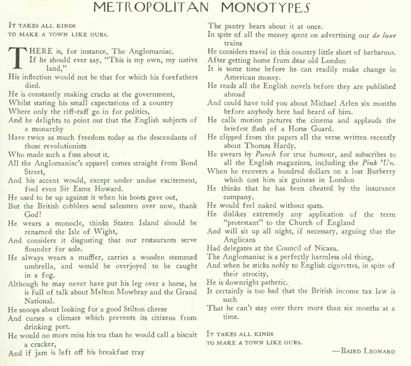 Another humorist who regularly contributed to The New Yorker was Baird Leonard, who beginning with the second issue of the magazine (Feb. 28, 1925) wrote a series titled “Metropolitan Monotypes.” Over five years and 36 installments Leonard wrote free-verse characterizations of various New York “types,” from debutantes to aesthetes to “The Anglomaniac” as described below in this installment from March 31, 1928: