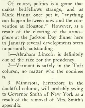 Regarding item No. 3, Sullivan was referring to Minnesota’s famed Mayo Clinic, and the related pride that was doubtless associated with the removal of an appendix from Catherine Dunn, the wife of Al Smith, four-term governor of New York and nominee to lead the Democratic ticket.
