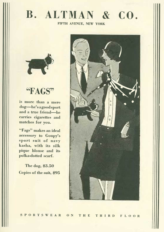 As noted before, Anglophilia oozed from The New Yorker ads, particularly those directed at the male reader (France was a common lure in ads for women). Every issue from the 1920s is rife with examples, but sticking to the March 31 issue we find this ad employing the British slang for cigarettes to market a silly, dog-shaped cigarette case to fashionable women: