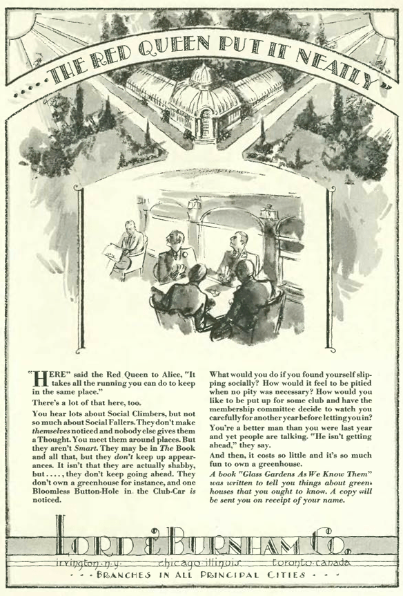Advertisers could also create demand by appealing to readers’ cravings for status. The following ad for a Lord and Burnham greenhouse is an especially egregious example of the use of status shaming to sell a product. Note how the foursome in the illustration, presumably all greenhouse owners, look at the man without a greenhouse as though he’s a child molester or worse.