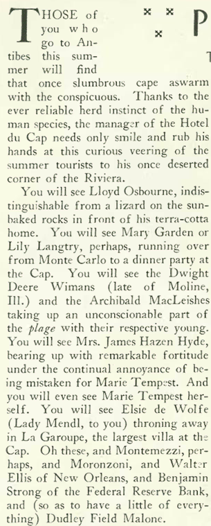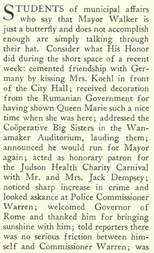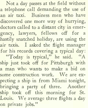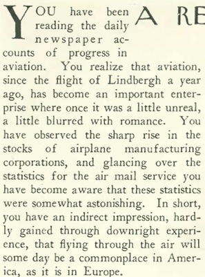 Such was the case with even a clear-headed writer like Morris Markey, who in his “A Reporter at Large” column looked at our progress in aviation. Public interest in air travel grew dramatically after Charles Lindbergh’s 1927 Atlantic crossing, as did the expansion of air mail and passenger service and the growth of private plane ownership. As Markey noted in this opening paragraph, for all the advances in American aviation, the Europeans were well ahead in establishing regular passenger service, as it had become “commonplace”: