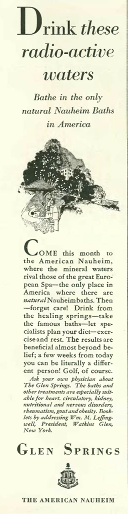 Why they called the waters “radio-active” escapes me. There were a lot of quack medical cures floating around in the 1920s—some of them quite dangerous—so I’m guessing that the proprietors of Glen Springs were adding radium to the water in some of their treatments, or maybe just claiming that radium was present in the water. Although Marie Curie (a pioneering researcher on radioactivity) and others protested against radiation therapies, a number of corporations and physicians marketed radioactive substances as miracle cure-alls, including radium enema treatments and radium-containing water tonics.