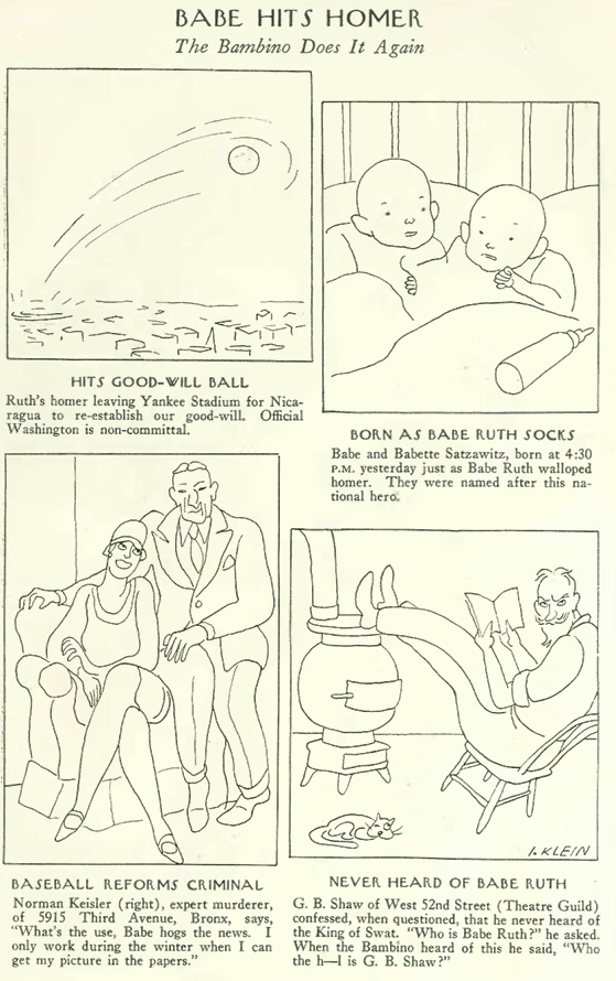 The cartoonist Isadore Klein had some fun with the hyperbole often attached to the athletic feats of the Sultan of Swat: