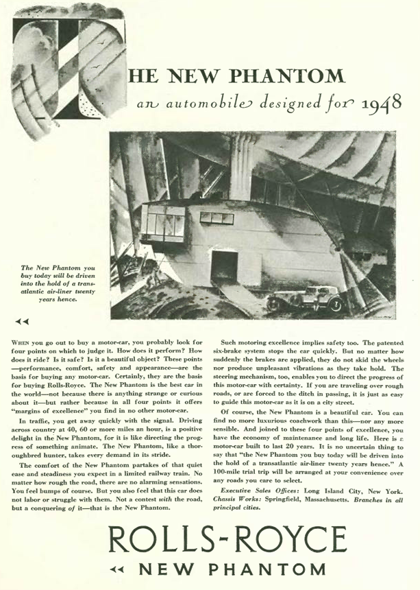 And back to the June 2, 1928 issue, we find this ad for Rolls Royce that offered a vision of a future airliner—in the year 1948. Since the artist had no clue what the future would hold, he conjured up this contraption that looked like a streamlined Noah’s Ark attached to a huge zeppelin.