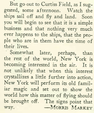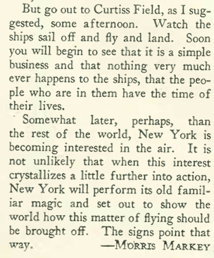 Although Markey lamented the slow growth of New York aviation, he was nevertheless dazzled by the “ships” taking to the skies at Curtiss Field.