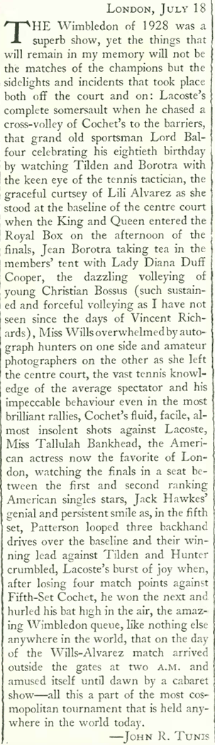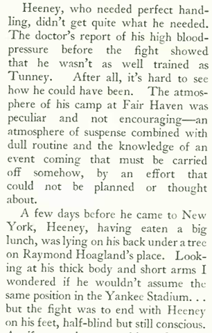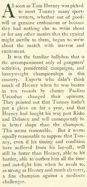 Writing in his column, “Sports of the Week,” in the July 21, 1928 issue of The New Yorker, Niven Busch Jr. assessed Heeney as a formidable opponent: