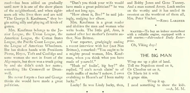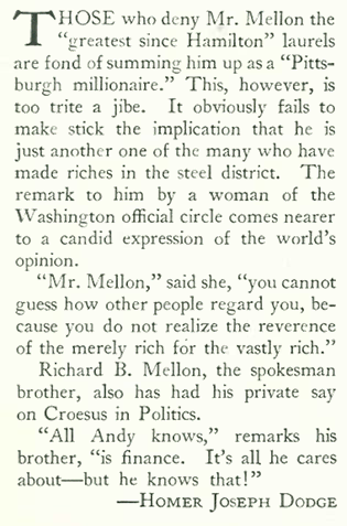 And perhaps even less exciting than the Olympics was the magazine’s “Profile” subject, Andrew W. Mellon, referred to in the title as “Croesus in Politics.” Mellon was no Gene Tunney, but he did ensure his immortal fame through his philanthropy, still expressed today by the Andrew W. Mellon Foundation. Below are the concluding lines of the profile, written by Homer Joseph Dodge: