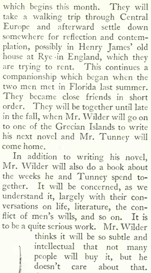 Heeney would remain in the U.S. and fight a few more bouts before retiring to Florida, where he ran a bar and fished with his friend, Ernest Hemingway. Tunney, on the other hand, announced his retirement from boxing just five days after the fight. It was time to finally devote himself to a life of the mind. Norman Klein, writing in the Aug. 4 “Talk of Town,” offered a glimpse into that new life: