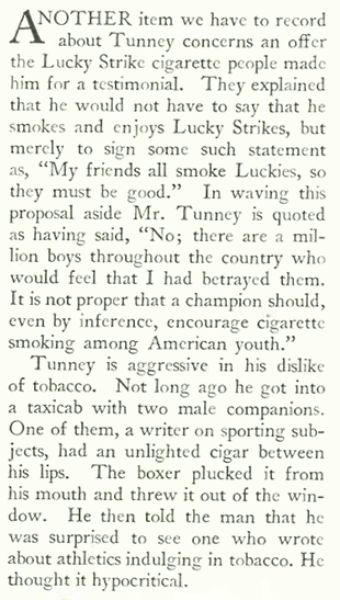 Still not getting enough of The Champ, “Talk” also related this story about Lucky Strike cigarettes, and how that company’s publicists tried unsuccessfully to persuade Tunney to endorse their product:
