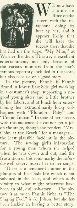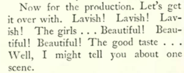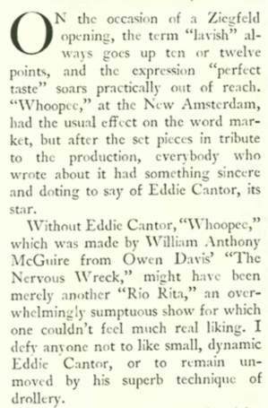 There is a filmed performance of Eddie Cantor allegedly made that night at the Ziegfeld Theatre Roof Garden, but it was actually filmed on a soundstage at the Paramount Astoria studio in Queens. You can tell it is staged because during Cantor’s performance he recognizes some of the celebrities who were at the opening (the camera shifts to them as they take bows), but when he calls out Peggy Joyce the camera stays on Cantor. Apparently she didn’t find it necessary to participate in this charade. Nevertheless, this video gives you some idea of what was presented at the Midnight Frolic. And one wonders why Cantor performed in blackface, since it’s just his standard song and gags schtick: