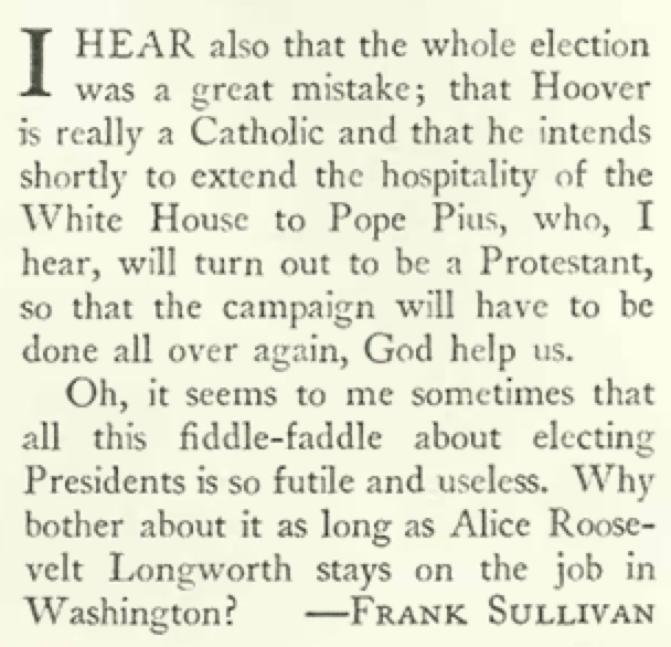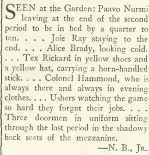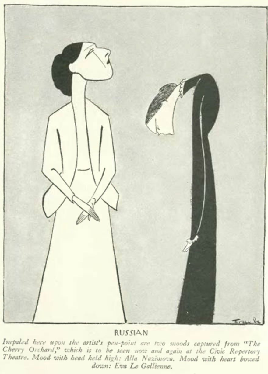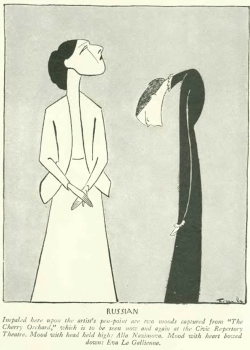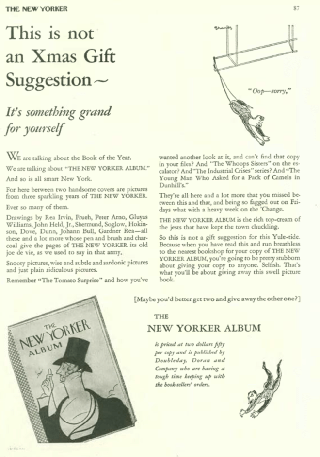 The New Yorker’s Lois Long was on hand for opening night of the Ziegfeld Midnight Frolic, where the rich and famous gathered to enjoy after hours performances by Paul Whitman’s orchestra, singer and comedian Eddie Cantor (performing in blackface), and the boozy torch singer Helen Morgan. In her nightlife column, “Tables for Two,” Long observed: