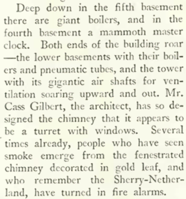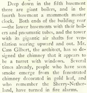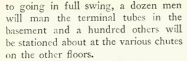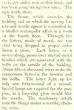 “Inside the control room, three cables poured energy into transformers. The hookup to all the bulbs totaled 88,000 soldered connections. Messages from a ticker came to a desk beside a cabinet like the case that contained type used by old-time compositors. The cabinet contained thin slabs called letter elements. An operator composed the message letter-by-letter in a frame. The frame, when filled with the letters and spaces that spelled out a news item, was inserted in a magazine at one end of a track. A chain conveyor moved the track, and each letter in the frame brushed a number of contacts. Each contact set a light flashing on Broadway.” Reilly calculated that there were 261,925,664 flashes an hour from the zipper’s 14,800 bulbs.
