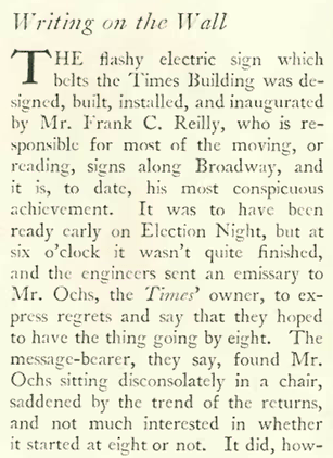 The “Talk of the Town” also marveled at the technology behind the famed news ticker in Times Square, inaugurated on election night the previous November: