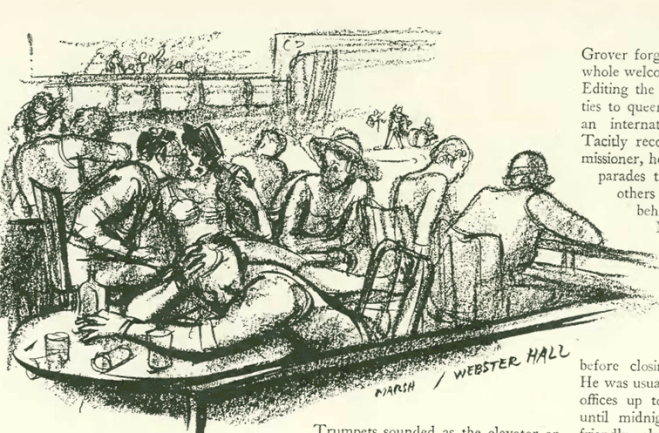 …and two terrific illustrations (out of four in a two-page spread) by Reginald Marsh that decorated the “Profile” section of the magazine, featuring scenes from the Webster Hall nightclub in the East Village…
