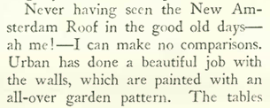 Bhat writes that the club “stayed open year-round for seven years and while World War I couldn’t stop the Midnight Frolic, Prohibition was ultimately what led Ziegfeld to end the show in 1922.” In 1921 Ziegfeld told The New York Times: “The best class of people from all over the world have been in the habit of coming up on the roof … and when they are subjected to the humiliation of having policemen stand by their tables and watch what they are drinking, then I do not care to keep open any longer.” The show Lois Long attended in January 1929 was a revival of the Midnight Frolic, and although Prohibition was still the law, by 1929 it was widely flaunted if not completely ignored by many New Yorkers. Long also noted changes to the rooftop, including a new decor by famed theatrical designer Joseph Urban: