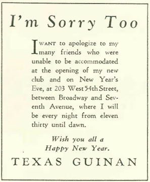 Also in the Jan. 12 issue was this small ad in the back pages — an apology from Texas Guinan, actress, producer, and entrepreneur well-known to New York nightlife (and to the vice squad):