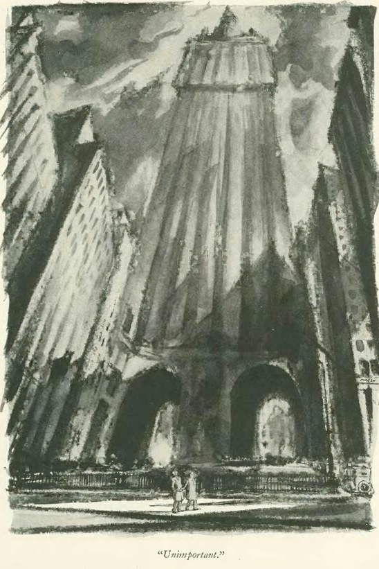 …and as we know, this was to become the famed Rockefeller Center, a complex of 19 buildings covering 22 acres between 48th and 51st streets. Led by by John D. Rockefeller Jr., the complex was conceived as an urban renewal project to revitalize Midtown (hard to imagine today). The land was originally envisioned as a site for a new Metropolitan Opera house, but when financing fell through the land’s owner, Columbia University, leased it to Rockefeller. Of the anticipated effect of the project, Ingersoll and Thurber wrote: