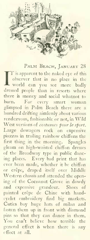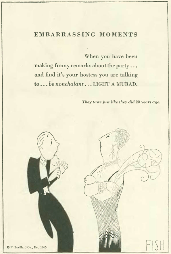 Jumping back to the Feb. 9 “Talk of the Town,” we have this complaint from the magazine regarding celebrity cigarette endorsements. Although the magazine derived a lot of revenue from cigarette ads, Harold Ross insisted on a strict separation between editorial and advertising, allowing his writers free reign to bite the hands that fed them, if they so wished: