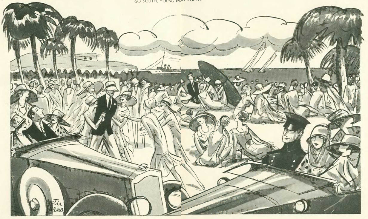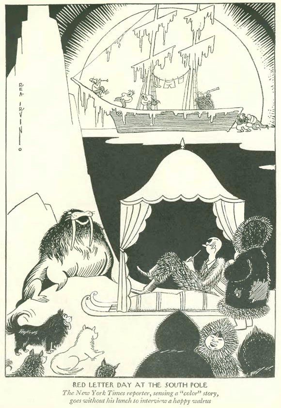 And finally our cartoons, all from the Feb. 9 issue. This first is a six-panel series by Al Frueh that originally ran diagonally, top to bottom, across a two-page spread. It took a shot at the self-promoting police commissioner, Grover Whalen, who was not a friend to the New Yorker due to his ham-fisted approach to Prohibition enforcement…
