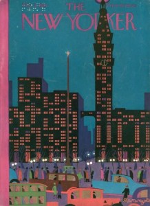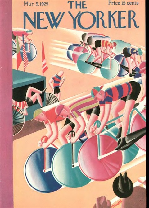 Before we delve into the Met’s exhibition, The Architect and the Industrial Arts, a quick note about the New Yorker’s Theodore Haupt-illustrated cover, which referenced the annual Six-Day Cycling Race that was taking place at the Madison Square Garden Velodrome. The event, which began at the old Madison Square Garden in 1891 and lasted until 1950, featured a beer garden (after Prohibition) in the center of the oval and drew such celebrities as Bing Crosby, Barbara Stanwyck and Peggy Joyce. It was said that Crosby even paid the hospital bills of riders who fell during the race.