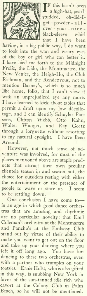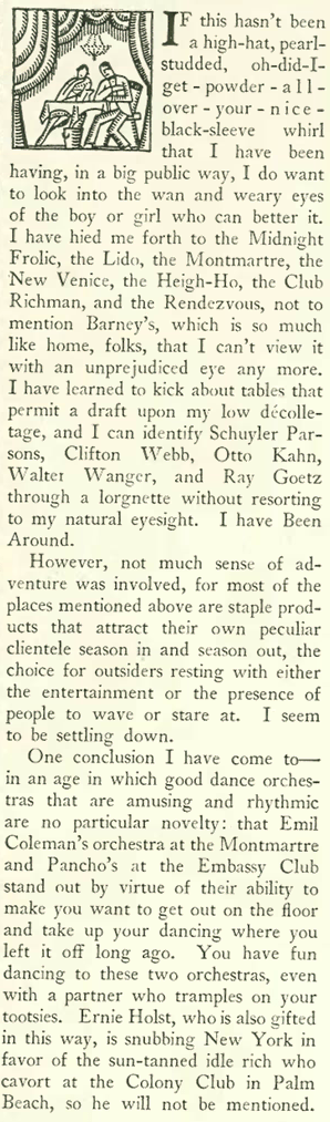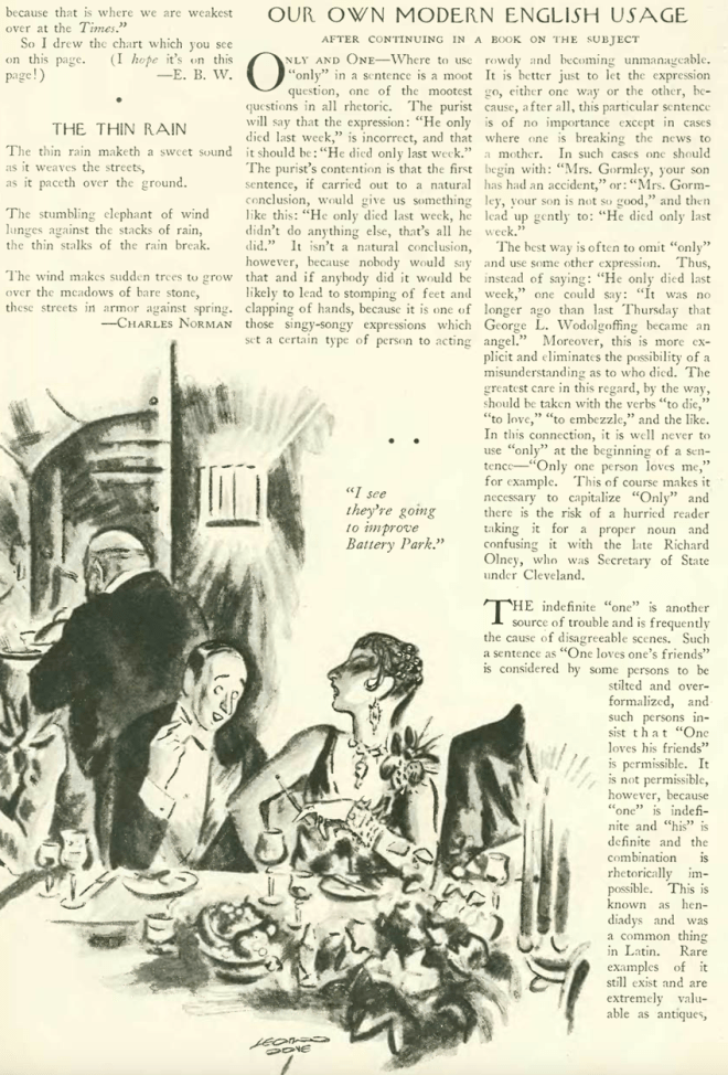 The March 9 issue was lively with another contribution from Groucho Marx (“Press Agents I Have Known”) and an Alexander Woollcott-penned profile of playwright and screenwriter Charles Gordon MacArthur (husband of stage actress Helen Hayes and father of James “Book ’em Danno” MacArthur).