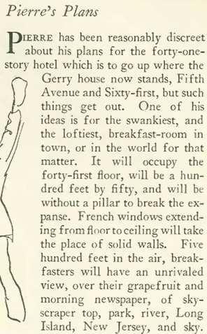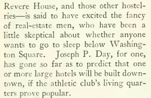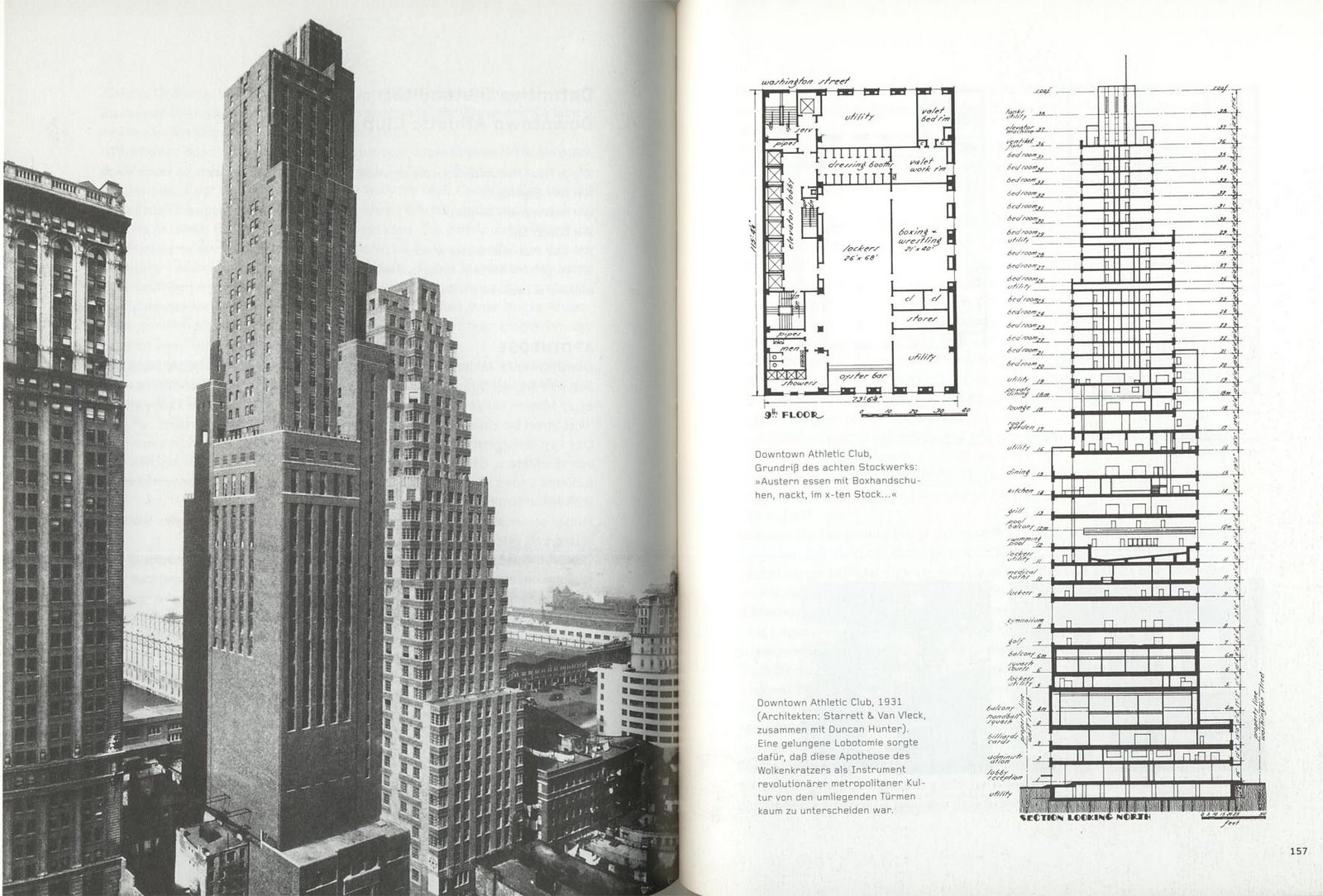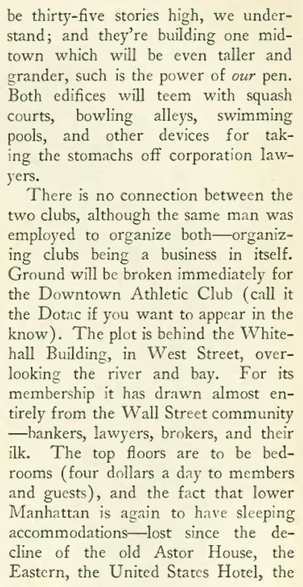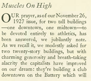 Hohlt writes that Koolhaas sees the Downtown Athletic Club as a sterile place: “Towering in the sky, the Club removes men from the rest of the world and allows them a kind of aesthetic improvement that cannot be passed on.” E.B. White took a less jaded view in this “Talk of the Town” segment: