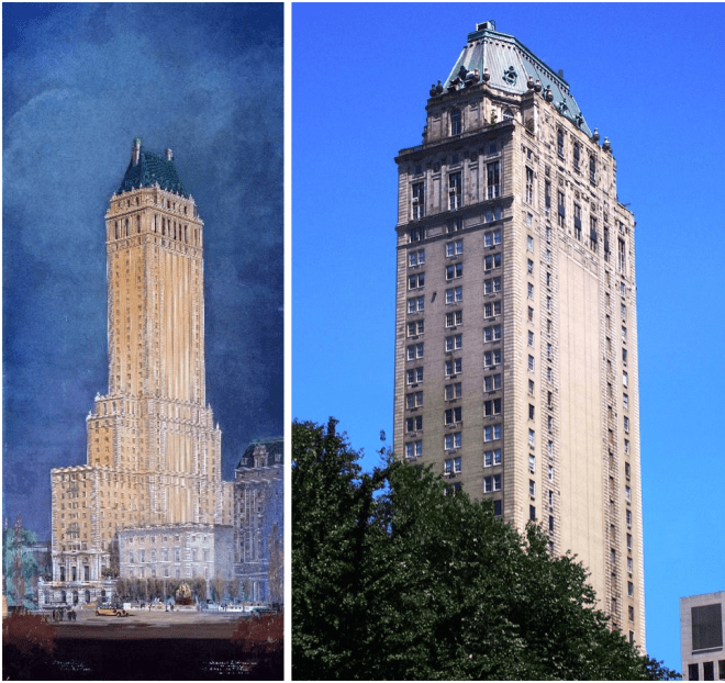 A corresponding note: Shreve & Lamb’s 1927 General Motors Building was the hub of Columbus Circle’s Automobile Row. A hideous 2012 remodel, which clad the entire structure in reflective glass, has rendered the former landmark unrecognizable: