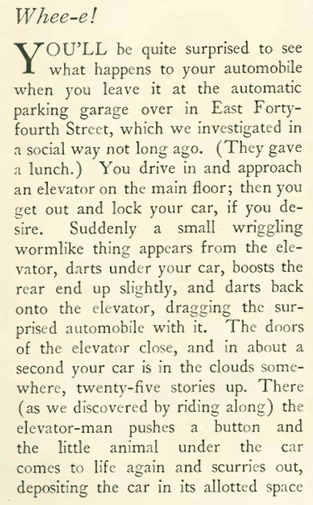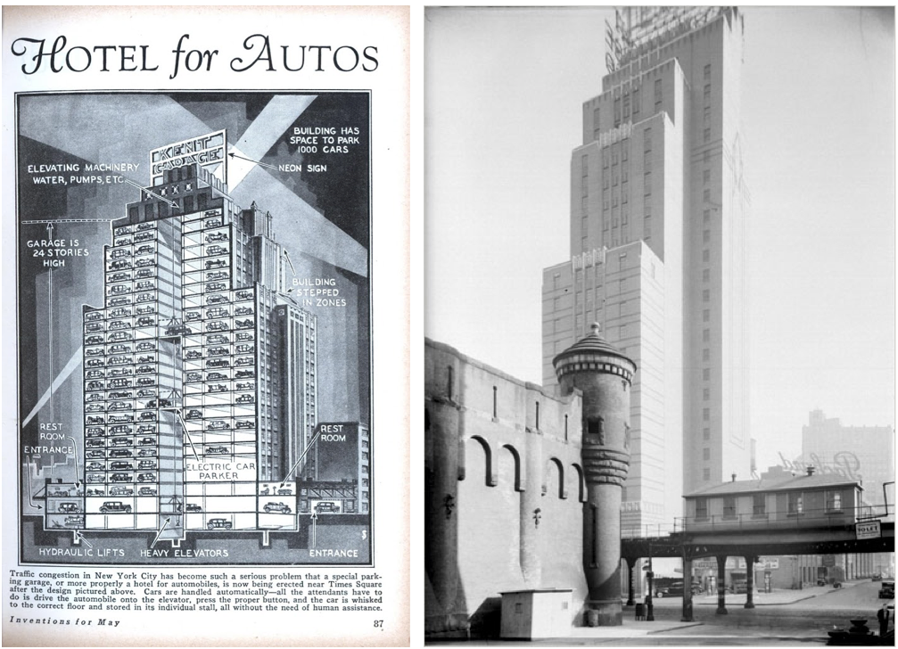 Another New Yorker who saw the “real potentialities of our crowded lives” was insurance salesman Milton A. Kent, who in 1928-29 erected a brick and terra-cotta Art Deco tower that could park 1,000 cars using an automatic elevator system.