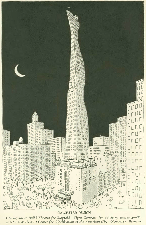 …and in the cartoons, a tongue-in-cheek vision of a modern high-rise by Al Frueh, prompted by the news that Florenz Ziegfeld planned to build a 44-story building in his native Chicago. Thanks to the market crash later in the year, it was never realized.