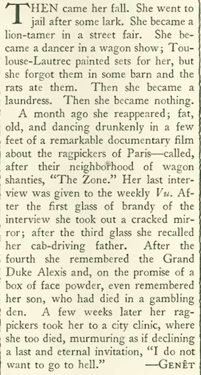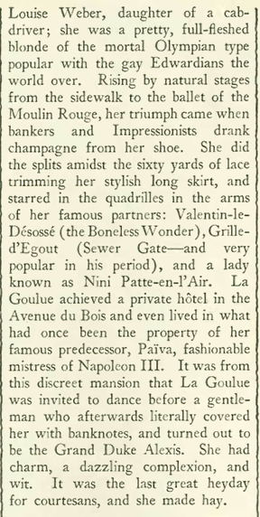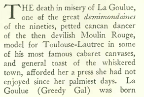 The sad death of Louise Weber, aka La Goulue, was announced in Janet Flanner’s “Letter from Paris” column. Weber was a can-can dancer at the Moulin Rouge in Paris and a model for some of Henri de Toulouse-Lautrec’s most famous cabaret paintings. Flanner wrote of La Goulue’s rise to fame…