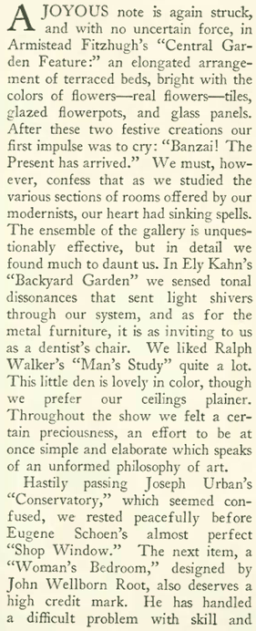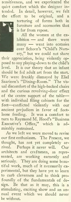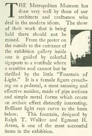 But as the blog title suggests, it was also filled with articles and ads that told of a city embracing all things new and modern, including a piece by architecture critic George S. Chappell on the Metropolitan Museum of Art’s eleventh Exhibition of Contemporary American Design, titled The Architect and the Industrial Arts. It was curated by the Met’s Richard F. Bach, who organized 15 annual exhibitions of contemporary industrial art at the museum between 1917 and 1940.