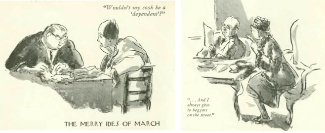 In drawings sprinkled across pages 24-25, Helen Hokinson examined various approaches to tax season, including these two examples…