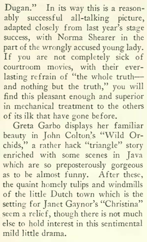Also known as the “girl with the curls” for her famous ringlets, fans were shocked to find those ringlets replaced by a short bob in Pickford’s first talking film, Coquette, in which she played a reckless socialite. The New Yorker was not shocked; on the contrary, it found Pickford’s depiction of a coquette rather forced, and not altogether believeable: