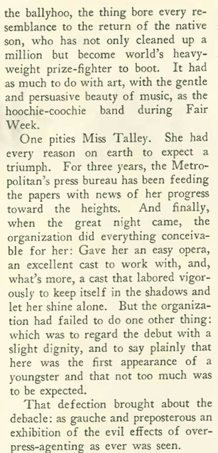 Enter one Marion Talley, a child prodigy from the tiny town of Nevada, Missouri. After appearing in a lead role at age 15 for the Kansas City Grand Opera, excited civic leaders raised enough money to send Talley to New York to study voice. Four years later (February 1926) she made her Metropolitan Opera debut as Gilda in Rigoletto — at that time the youngest prima donna to appear on the Met stage. A delegation of Kansas City’s two hundred leading citizens (including the mayor) travelled to New York via special train to attend the performance. Adding to the spectacle, a noisy telegraph machine was set up backstage so Talley’s father could send dispatches back home during the performance. Writing in his “A Reporter at Large” column for the New Yorker’s Feb. 27, 1926 issue, Morris Markey scoffed at the hype and Babbitry on display: