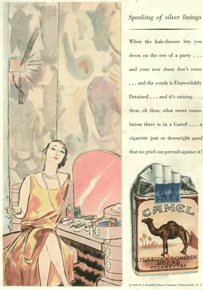 Cigarette manufacturers used a variety of marketing techniques to promote their tobacco products. During the late 1920s and early 30s R.J. Reynolds sought to attract more women smokers through a series of stylish ads for its Camel brand that evoked a softly elegant world. These ads were illustrated by Carl Erickson (1891–1958), a fashion artist whose work was widely seen in Vogue and in promotions for Coty cosmetics. This ad appeared in the April 20 issue of the New Yorker:
