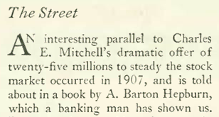 The “Talk” item references a $25 million advance Mitchell offered to stock market traders who were getting the yips in an overheated market. This happened after a “mini crash” on March 25, 1929, when the Federal Reserve told its banks to withhold all loans to finance securities. Mitchell’s announcement apparently reassured the public enough to stop the panic, but in reality it only delayed the inevitable—a major market crash brought on in large part by the over-selling of securities by Mitchell’s bank.