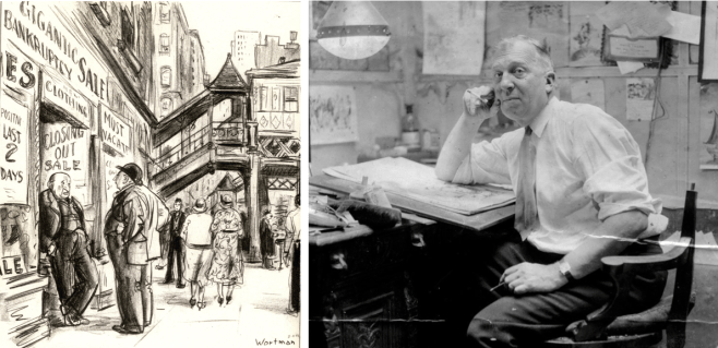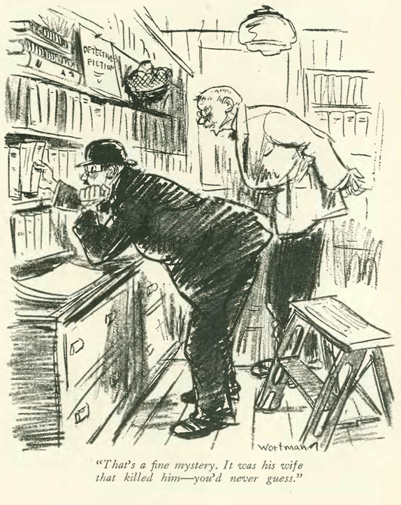 …Denys Wortman (1887-1958) looked in on a bookseller with a “spoiler” problem. From 1924 to 1954 Wortman drew the nationally syndicated comic strip Metropolitan Movies for the New York World. The beautifully drawn strip offered a naturalistic portrayal of daily life in New York City…