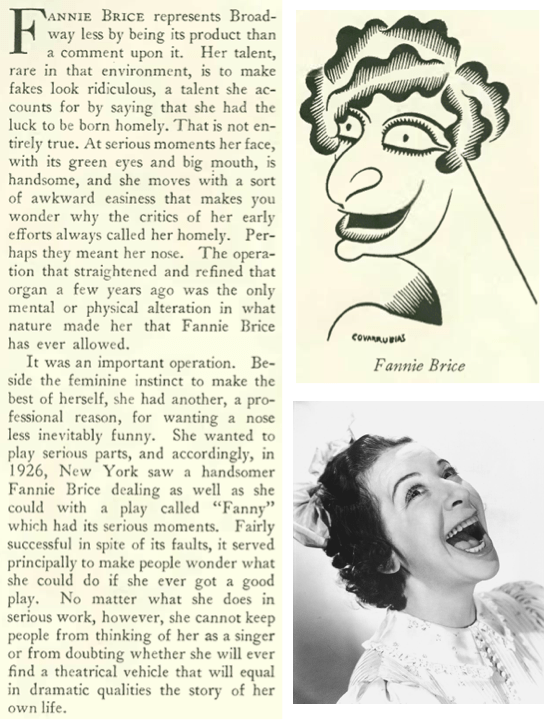 One of Broadway’s biggest stars in the 1920s, Fanny Brice (1891-1951) was profiled by Niven Busch Jr. in the April 20 issue. In addition to her work with the Ziegfeld Follies and other stage productions, by 1929 the comedian, singer and actress had recorded two-dozen songs and appeared in the 1928 film, My Man. Brice’s star would continue to rise in the 1930s and 40s, especially on the radio portraying the bratty toddler “Baby Snooks.” Here are the opening lines of the profile, which included a caricature of Brice by Miguel Covarrubias: