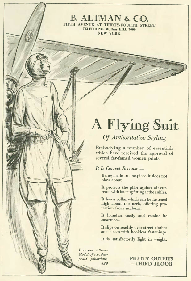 Last week B. Altman offered rugged coats for those brave souls riding in rumble seats. This week Altman rolled out some stylish wear for the enterprising pilot of 1929…