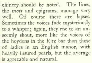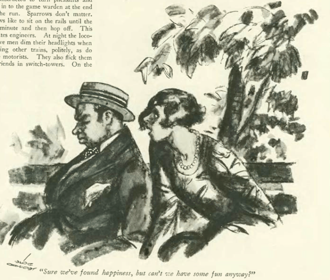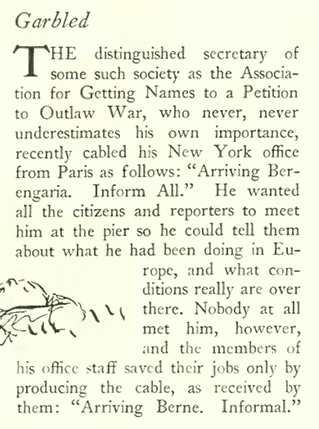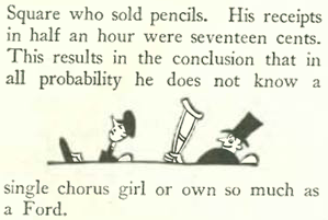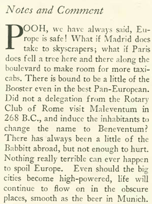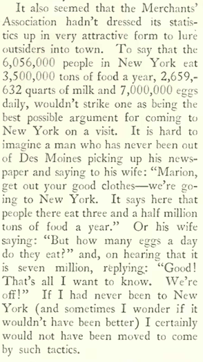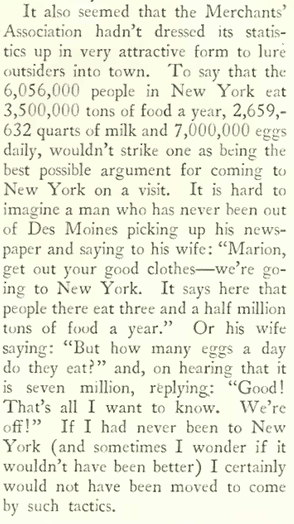 On to sillier things, Robert Benchley turned in a casual titled “Boost New York!” Benchley ridiculed a promotional brochure from the New York Merchants Association that touted various statistics in a manner reminiscent of the fictional George Babbitt. Benchley imagined how an Iowa couple might respond to such dazzling numbers:
