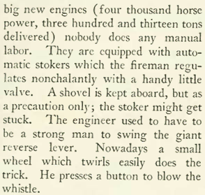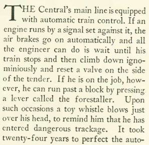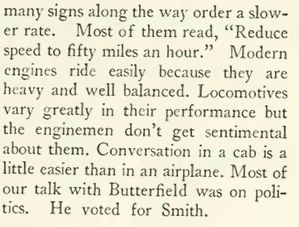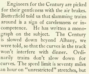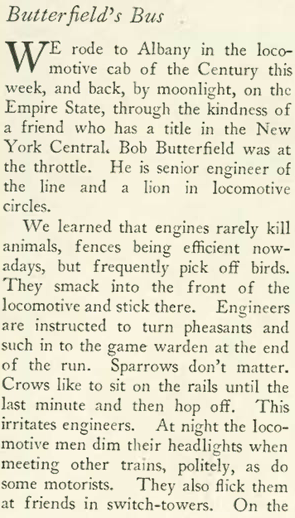 TheNew Yorker’s managing editor, Ralph Ingersoll (1900-1985) writing in “The Talk of Town,” climbed aboard the locomotives of outbound 20th Century and an inbound Empire State trains to survey the latest technology in rail travel. What one gleans from reading this account is how much this mode of travel has declined (in the U.S.) over the past 90 years: