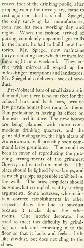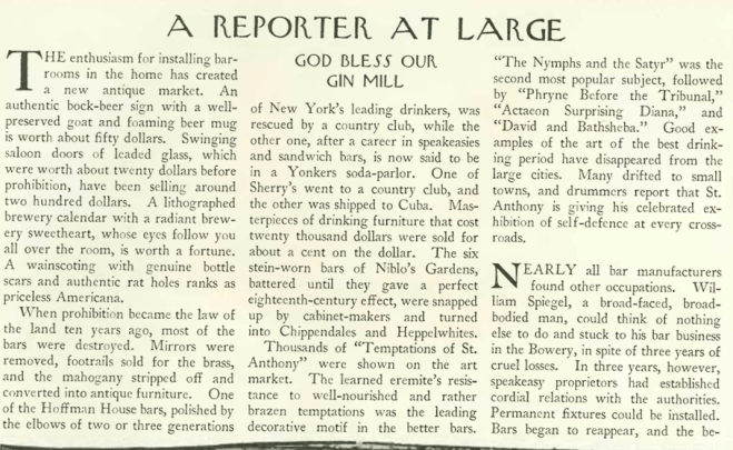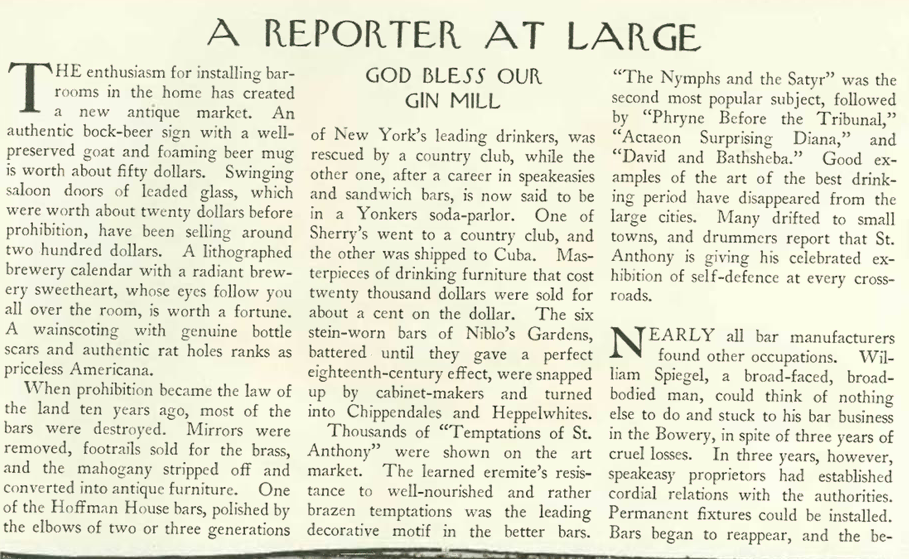 From 1928 until his death in 1950, the journalist Alva Johnston (1888-1950) wrote on a diverse range of topics for TheNew Yorker, including this “Reporter at Large” piece on the proliferation of barrooms in private residences, hidden from the prying eyes of Prohibition agents and sometimes furnished with the bits and pieces that once graced some of New York’s finest watering holes, including the famed Hoffman House: