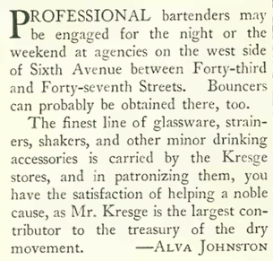 Johnston concluded his piece on an ironic note, pointing out that the finest cocktail sets could be obtained at Kresge department stores, which were owned by one of the biggest supporters of Prohibition, S.S. Kresge: