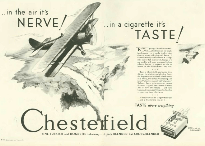 …and while you were up there, you could calm those nerves with a Chesterfield (a two-page ad that appeared regularly in TheNew Yorker)…