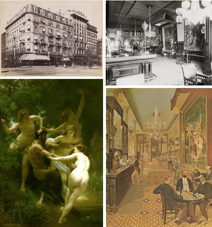 POPULAR WATERING HOLE…Clockwise, from top left: The Hoffman House Hotel at Madison Square in 1885; the Hoffman House bar, which prominently displayed William-Adolphe Bouguereau’s painting Nymphs and Satyr. According to Alva Johnston’s article, the painting was the second-most popular decorative motif in New York’s finer drinking establishments; artist’s rendering of the barroom; and Bouguereau’s Nymphs and Satyr. (Museum of the City of New York/Wikipedia)