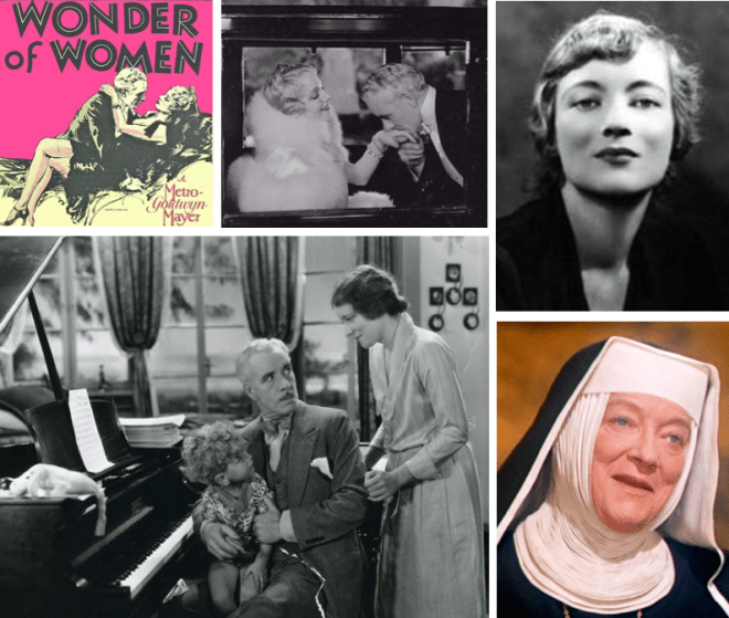 RECOGNIZE HER NOW?…Clockwise, from top left: theatre card for the 1929 film, Wonder of Women;Leila Hyams and Lewis Stone in a tender moment from the film (Stone was romantically paired with much younger women in several films around that time); Peggy Wood in the 1920s; Wood as Mother Abbess in 1965’s The Sound of Music; Stone and Wood in a scene from Wonder of Women, with four-year-old child actor Wally Albright. With his waifish demeanor and curly hair, Albright was highly sought after in films needing a cute kid. He appeared in seven films in 1929 alone. In the 1930s he would appear in several Our Gang/Little Rascal shorts, and would pop up in bit roles through the 1940s and early 50s. Unlike so many other child stars, he seems to have led a normal adult life. He won the Men’s National Track and Ski Championship in 1957, and later started a successful trucking firm. (IMDB/Pinterest)