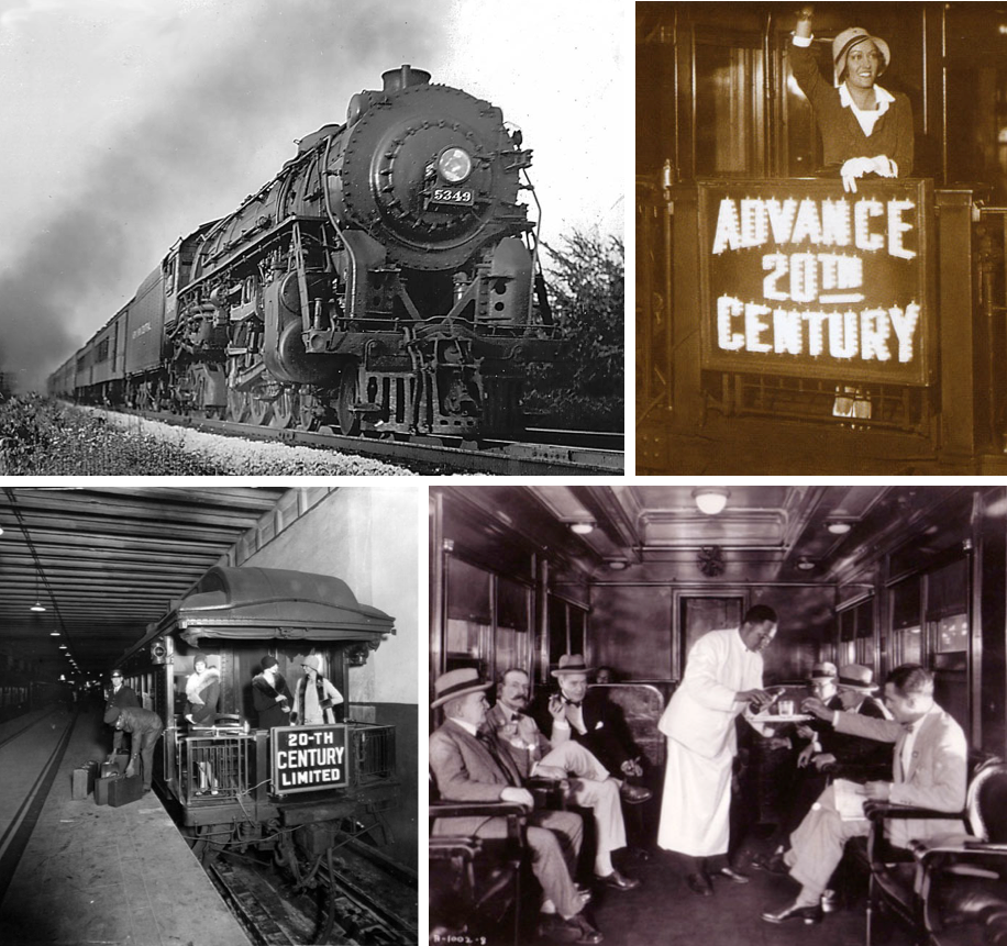 ROMANCE OF THE RAILS…Clockwise, from top left: Hudson locomotives served the Century and Empire State express trains; silent film star Gloria Swanson waves farewell from the observation platform as the 20th Century Limited pulls out of Grand Central during the 1920s; lounge car on the 20th Century during the 1920s; the 20th Century ready to depart Grand Central, circa 1930. (steamlocomotive.com/newyorksocialdiary.com/cruiselinehistory.com)