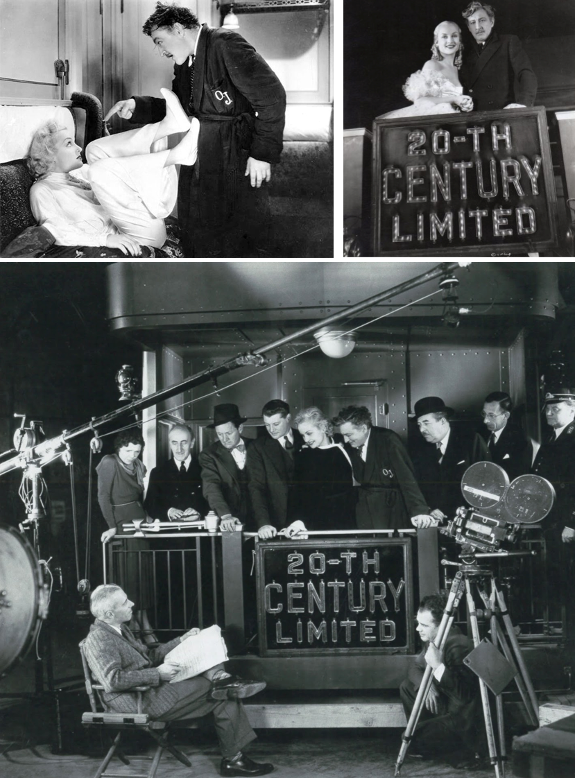CELEBRATED LINE…The 20th Century was widely celebrated in popular culture through the 1950s. Five years after Ingersoll’s article, Howard Hawks directed the screwball comedy, 20th Century. Clockwise, from top left, the film’s stars, Carole Lombard and John Barrymore in a scene from the film; the stars pose for a publicity shot; with director Hawks along with some of the cast and crew. (austinfilm.org/greenbriarpictureshows.blogspot.com)