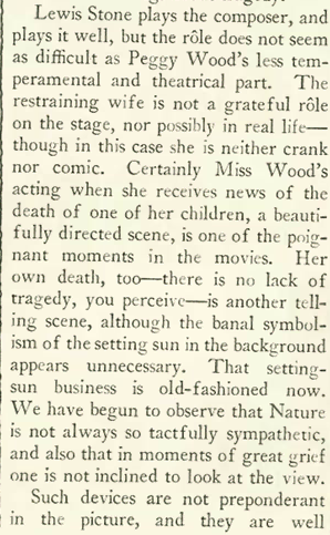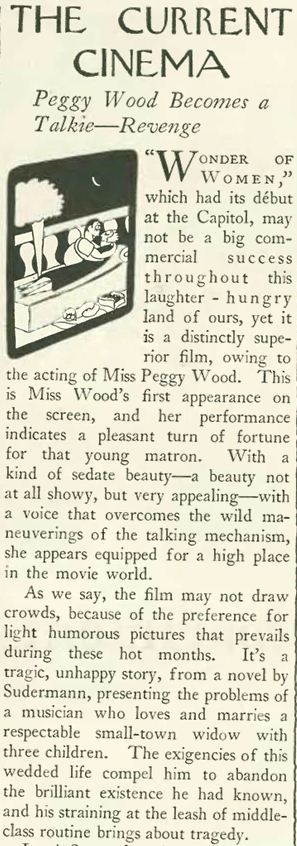 The Brooklyn-born Peggy Wood (1892-1978) made her stage debut in 1910 and was an established Broadway star before she made her first talking picture, Wonder of Women (a film believed to be lost). A member of the Algonquin Round Table, she was well acquainted with the New Yorker crowd. And the magazine in turn was very impressed with her acting talents, even if the picture she was in proved a bit of a downer:
